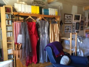 Armée de ma fidèle machine Singer 611G, je réalise mes tenues de scène : robes de concert, ou costumes d’Opéra. Je me rappelle que cette machine était déjà à la maison lors du passage du 110 au 220 volts, elle a donc plus de 60 ans… Ca ne se voit pas !